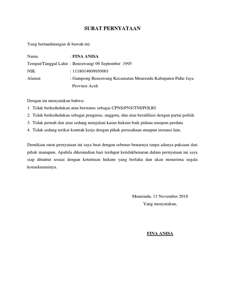 Tidak sedang menjadi calon pns, pns, anggota polri, atau tni republik indonesia. Menyatakan bahwa saya tidak terikat dengan instansi pemerintah atau badan usaha milik negara (bumn), dan saya bersedia mengikuti ketentuan serta peraturan yang ditetapkan apabila saya dinyatakan lulus ujian / diterima sebagai cpns kementerian hukum dan ham tahun 2012. Seperti surat pernyataan kerja bermaterai, perjanjian, dan pernyataan belum menikah. Surat pernyataan adalah sebuah surat yang dibuat oleh salah satu pihak sebagai bagian dari pernyataannya karena telah melakukan suatu tindakan dimana tindakan itu berhubungan dengan pihak lain. Surat pernyataan merupakan salah satu surat yang umum digunakan untuk berbagai macam hal. Isi dari surat pernyataan juga tidak boleh sembarangan diisi, namun harus sesuai dengan kenyataan mengenai pembuat surat pernyataan tersebut. Demikian surat pernyataan ini dibuat dengan sesungguhnya dan sebenarnya untuk dapat digunakan sebagaimana mestinya. Apakah kamu pernah diminta untuk membuat surat pernyataan ketika berurusan dengan pihak lain atau dengan suatu instansi? Yang bertandatangan di bawah ini, saya demikian surat pernyataan ini saya buat dan apabila dikemudian hari pernyataan saya ini tidak benar, saya bersedia mengembalikan ke kas negara atau menerima sanksi lainnya sesuai dengan ketentuan. Tanda tersebut selalu diletakkan pada bagian akhir surat dengan posisi di pojok kanan bawah lembar surat, letaknya berada persis di atas nama. Salah satu contoh dari surat pernyataan adalah surat pernyataan tidak terikat dengan instansi lain. Sifat dari surat pernyataan kerja adalah mengikat pihak terkait dengan pekerjaannya, misalkan tidak mengundurkan diri, siap ditempatkan. Saat ini sedang tidak terkait kontrak dengan pihak perusahaan atau instansi mana pun.